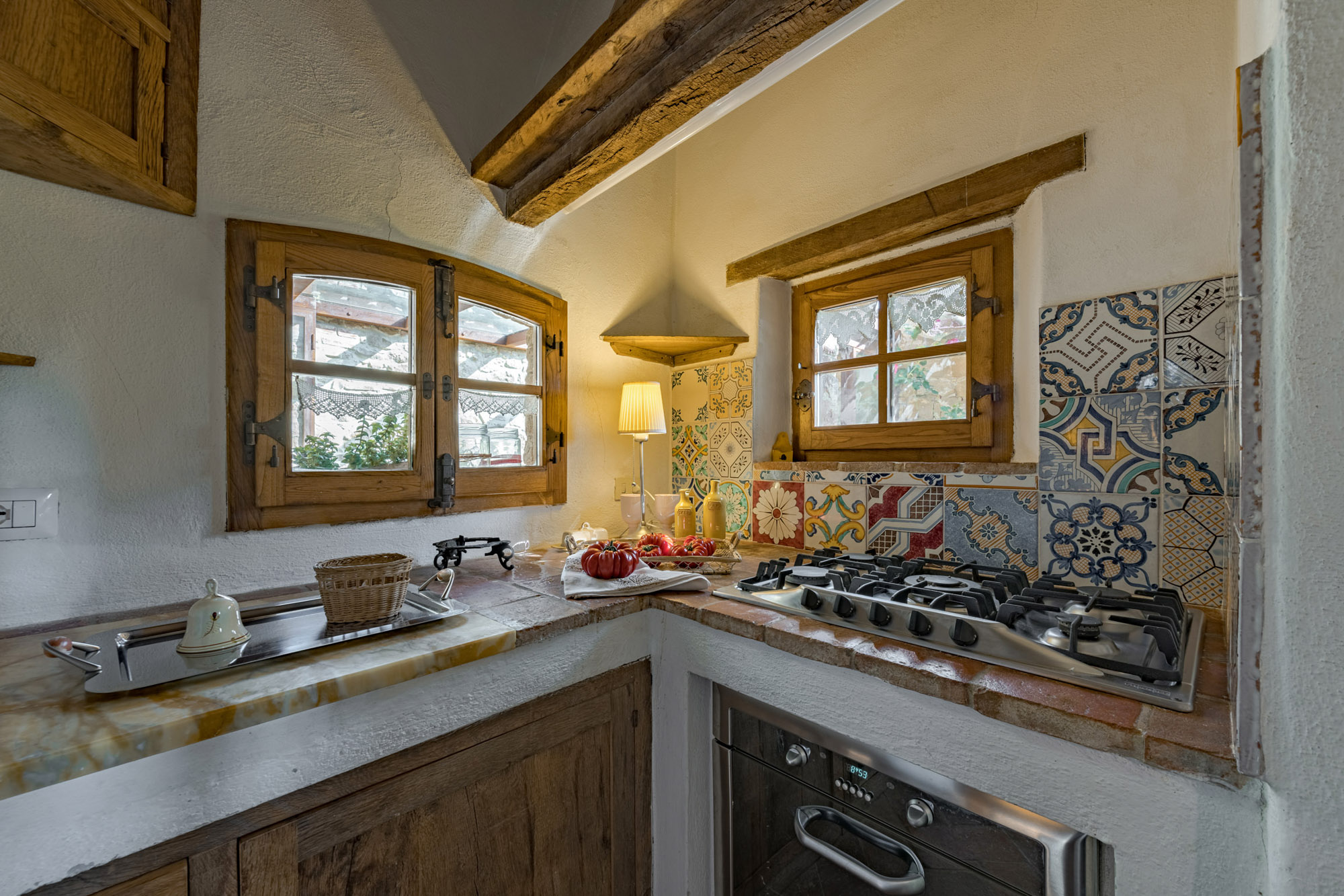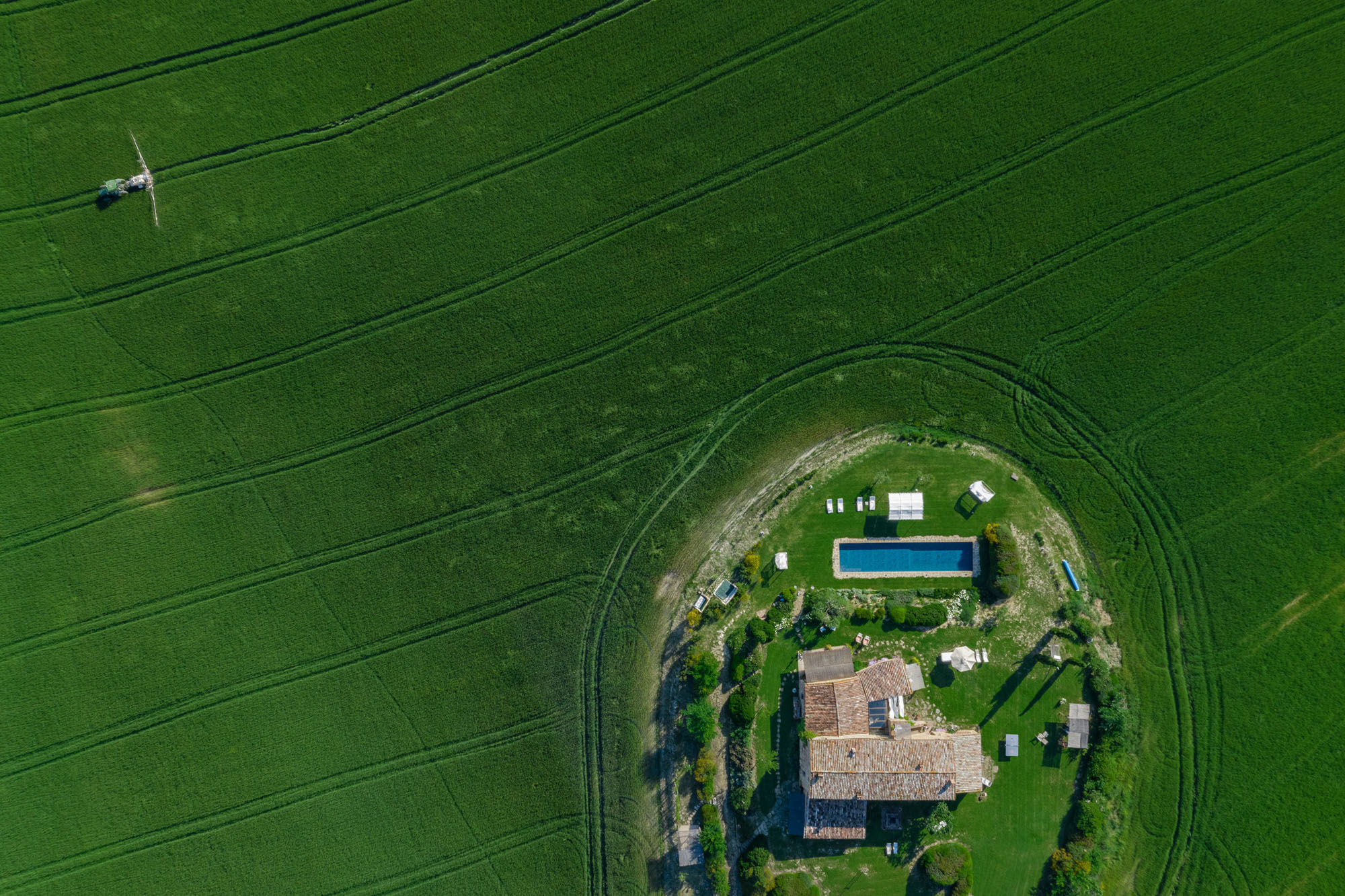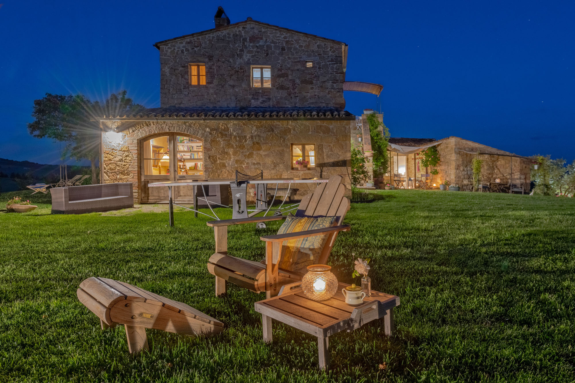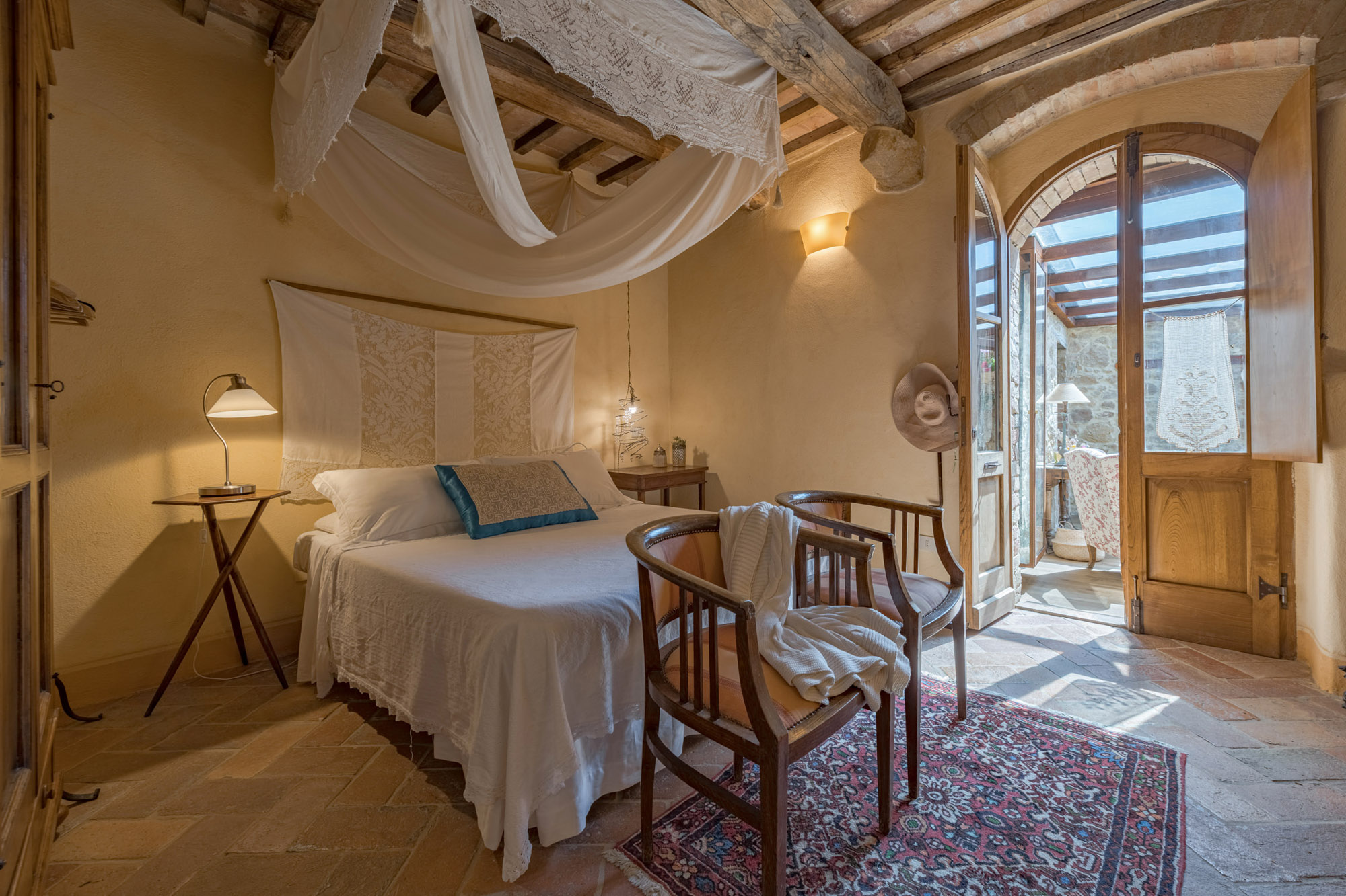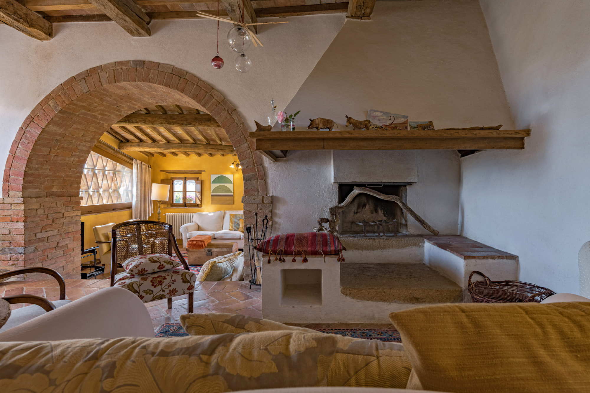 The six bedrooms have a romantic air; five are en-suite, one with a round bathtub and another with a hydromassage tub. There's a big Tuscan-style kitchen with modern amenities, a dining table for 12 and doors to the patio. The bright lounge, with its original feature fireplace, has access to a second, smaller kitchen for preparing drinks and snacks.