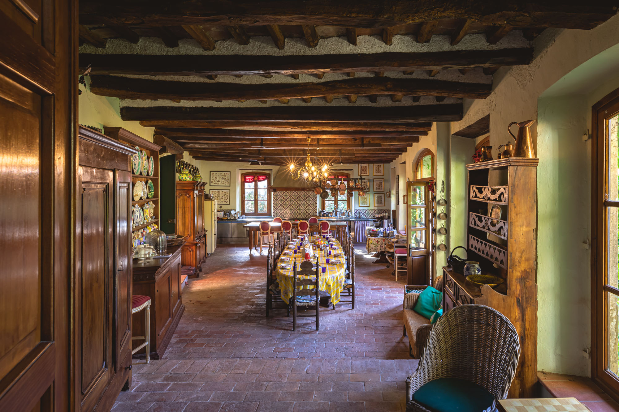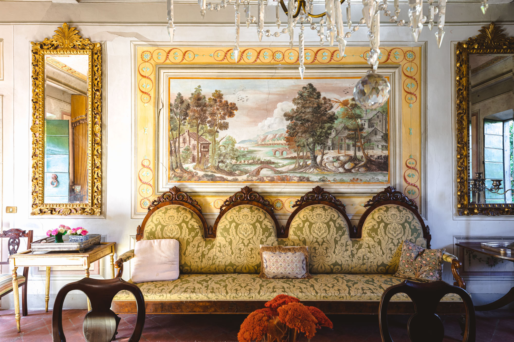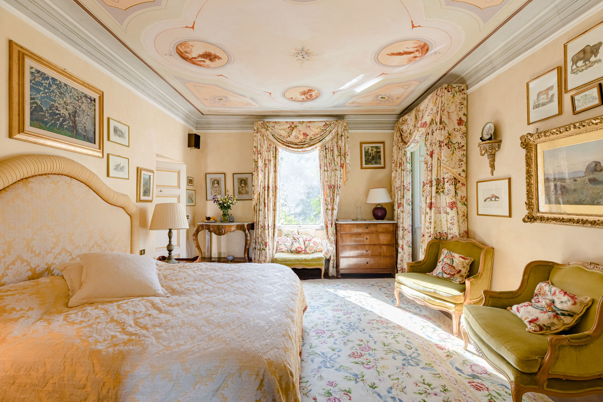The property sleeps up to 35 guests across 2 buildings. The main house has 12 colourful bedrooms and 11 bathrooms, and the guest house, just a few metres away, has 5 en-suite rooms. The property has several beautiful reception rooms, a drawing room with a piano, a large game room, and a TV room. However, the highlight is the grand dining room, which seats 32 and is adorned with original frescoes and antique Venetian chandeliers.