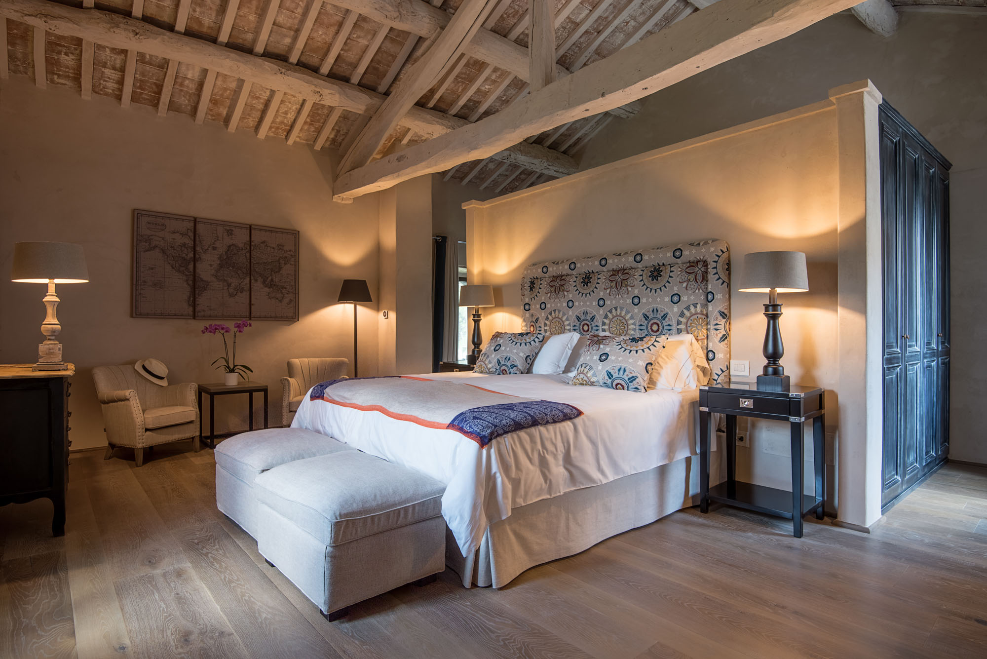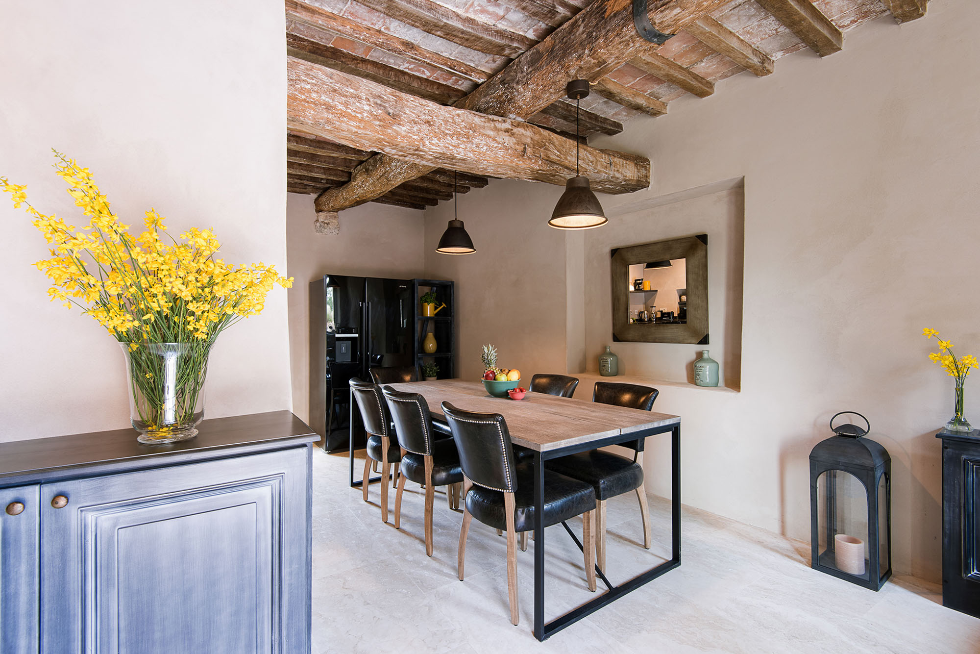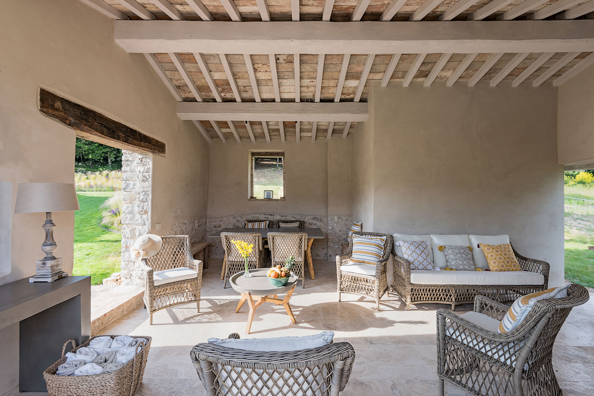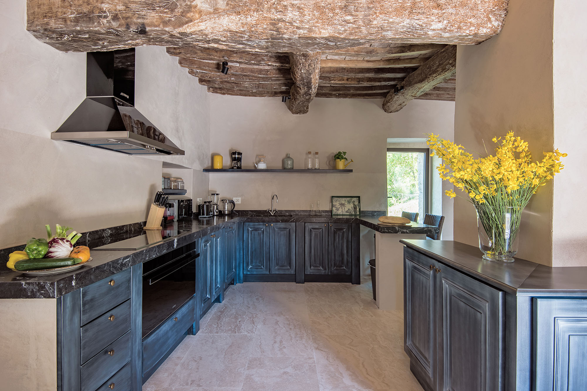 The spacious interiors combine traditional wooden beamed ceilings, modern furniture, contemporary colourful fabrics, and large open-plan living spaces. The bedrooms are large, with king-size beds and modern marble bathrooms, two in the main house and two in the annexe.