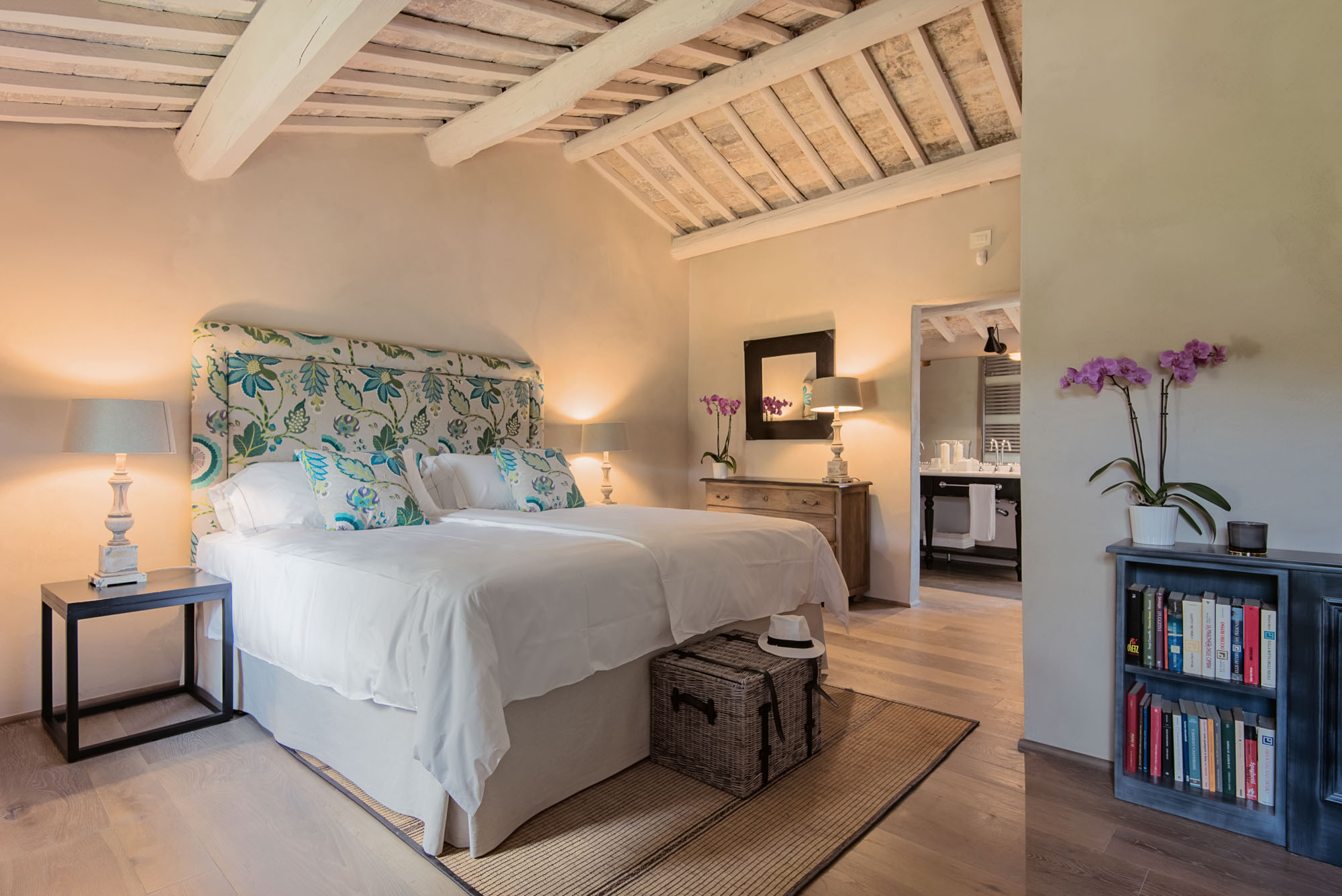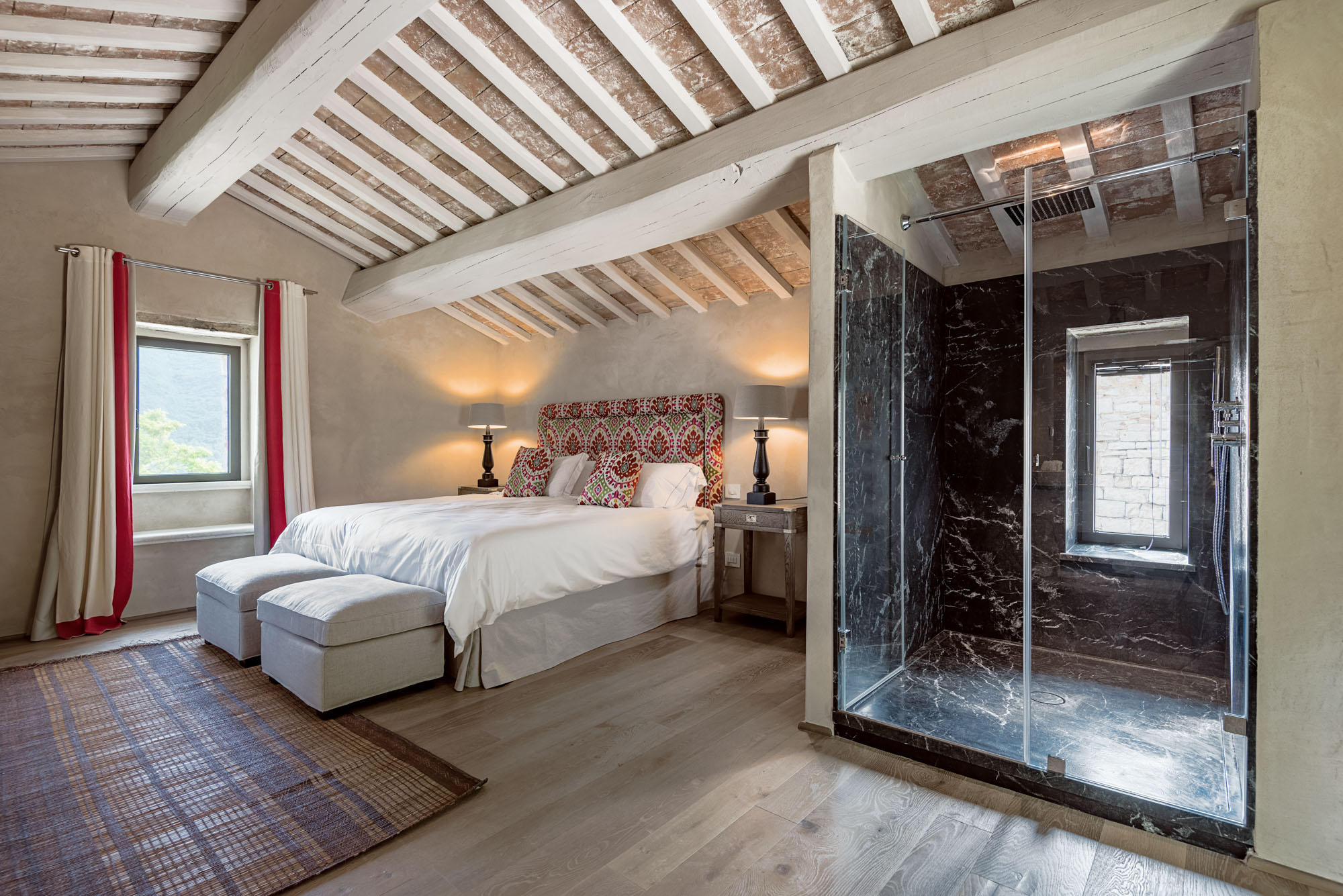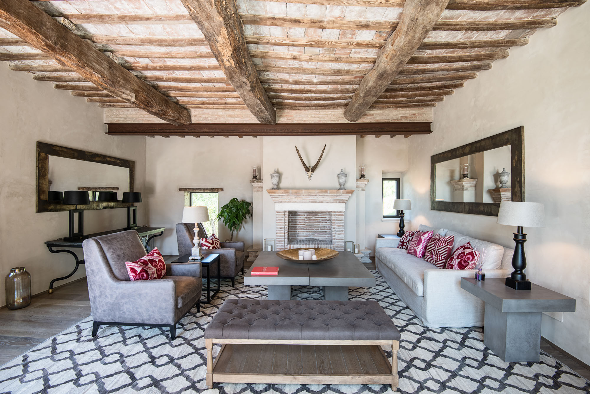 The spacious interiors combine traditional wooden beamed ceilings, modern furniture, contemporary colourful fabrics, and large open-plan living spaces. The bedrooms are large, with king-size beds and modern marble bathrooms, two in the main house and two in the annexe.