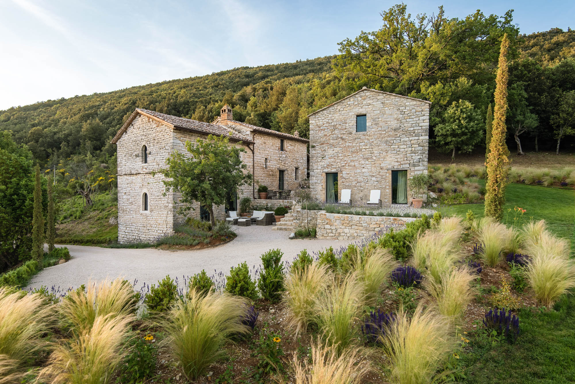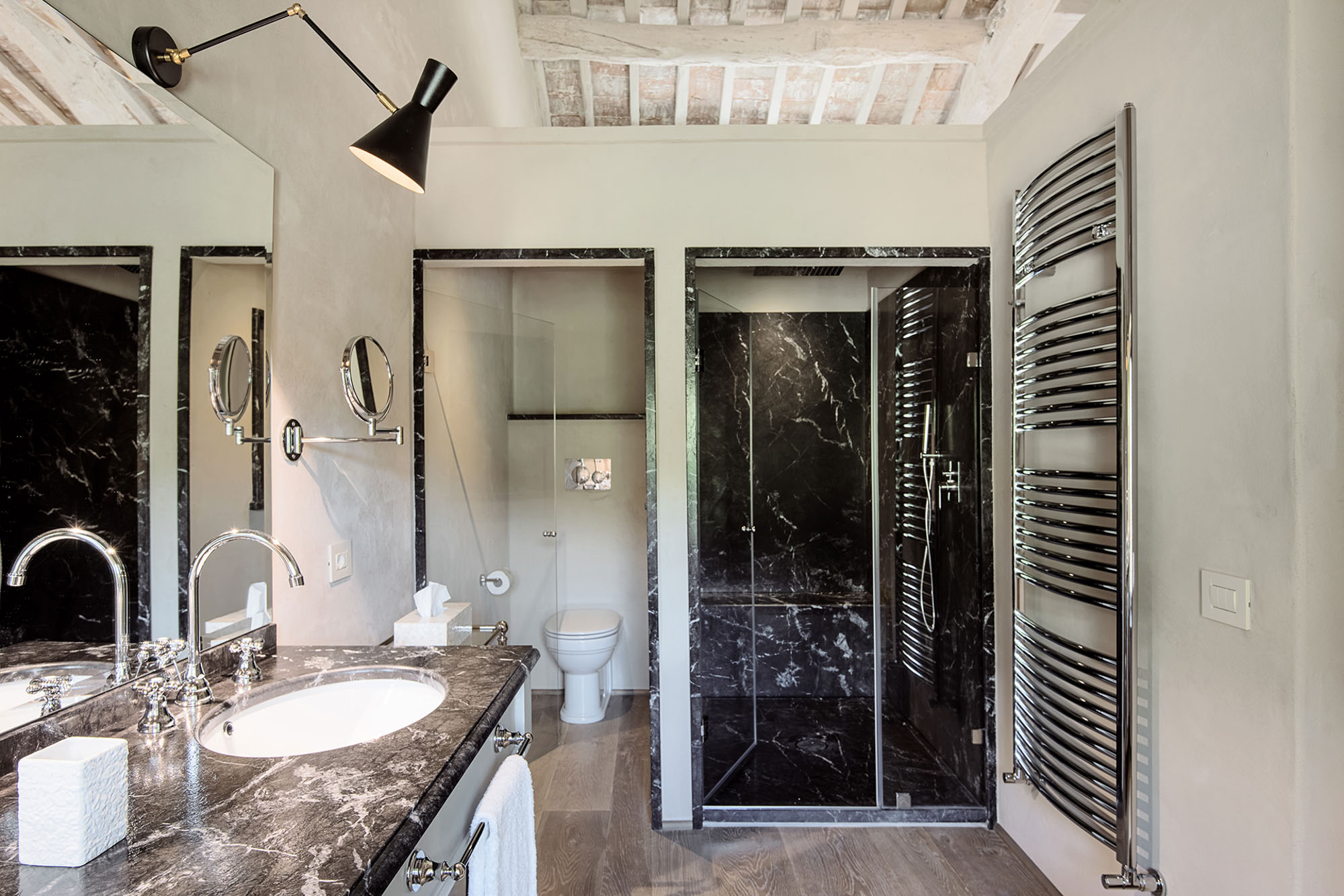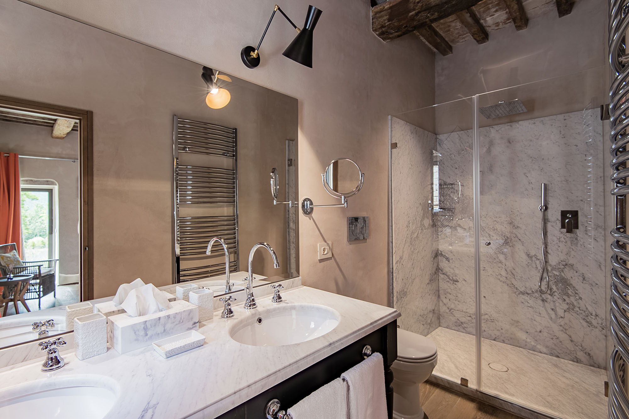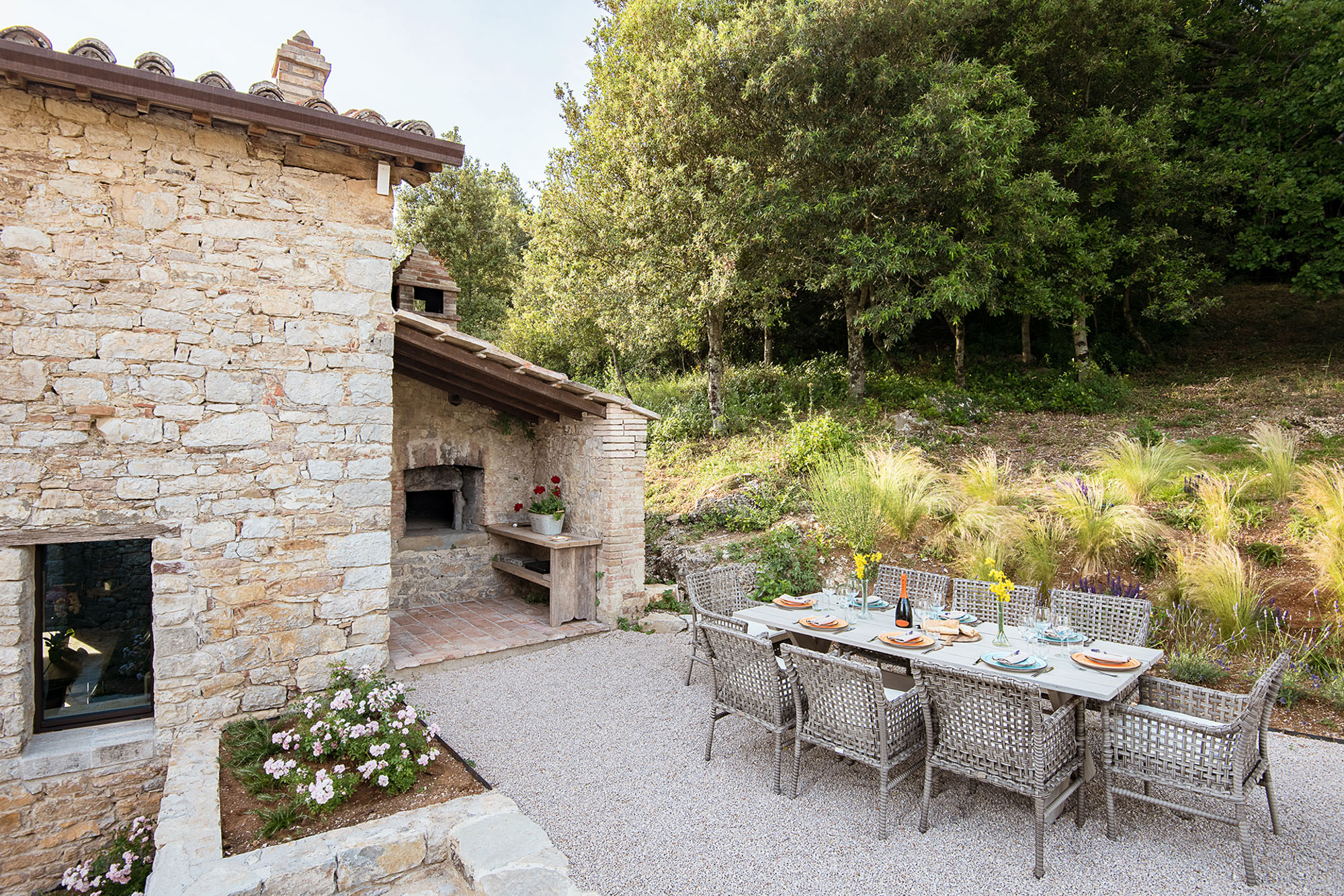 The spacious interiors combine traditional wooden beamed ceilings, modern furniture, contemporary colourful fabrics, and large open-plan living spaces. The bedrooms are large, with king-size beds and modern marble bathrooms, two in the main house and two in the annexe.