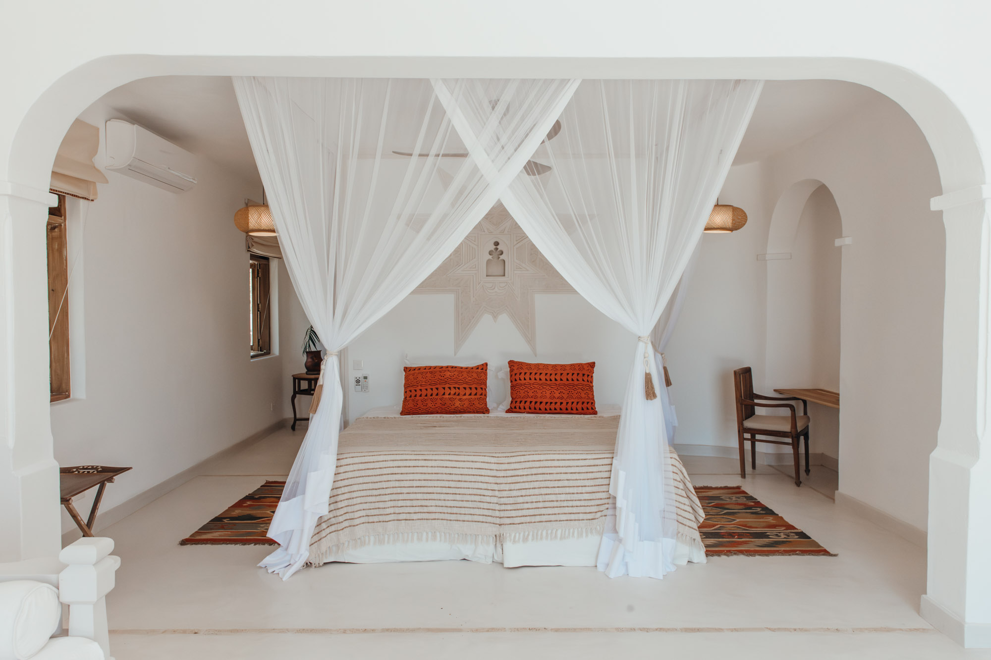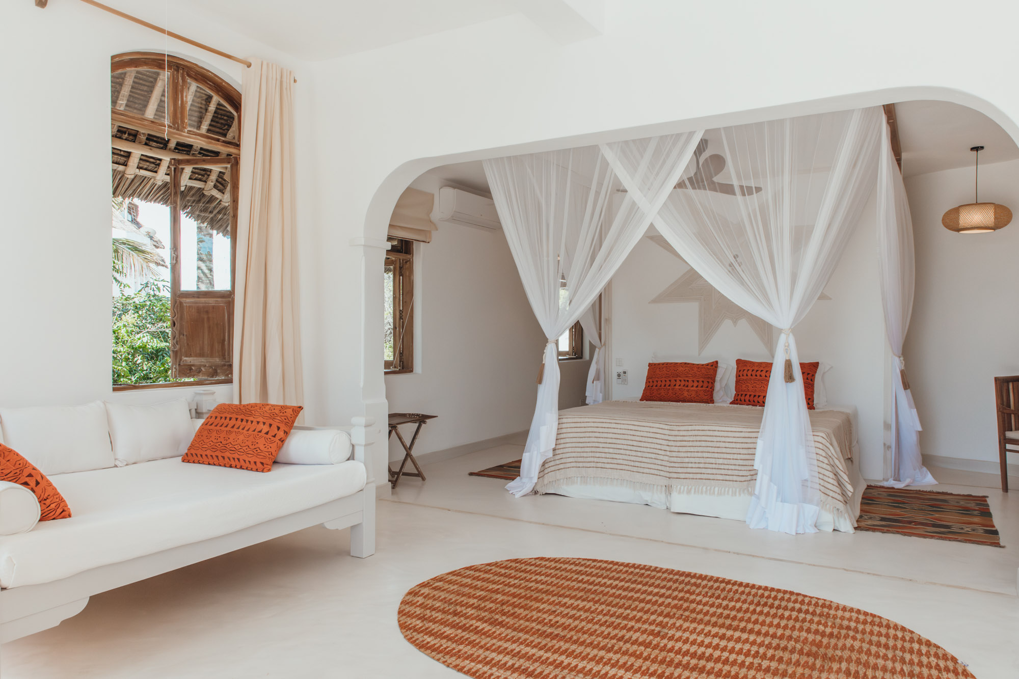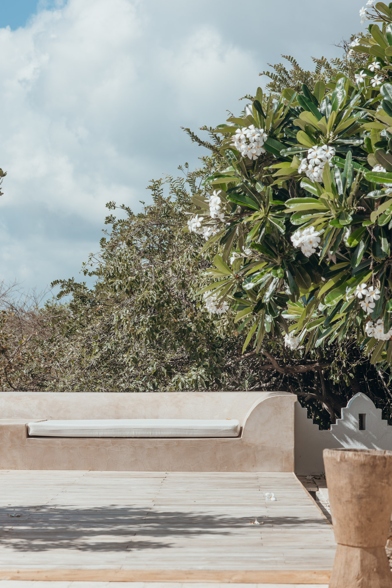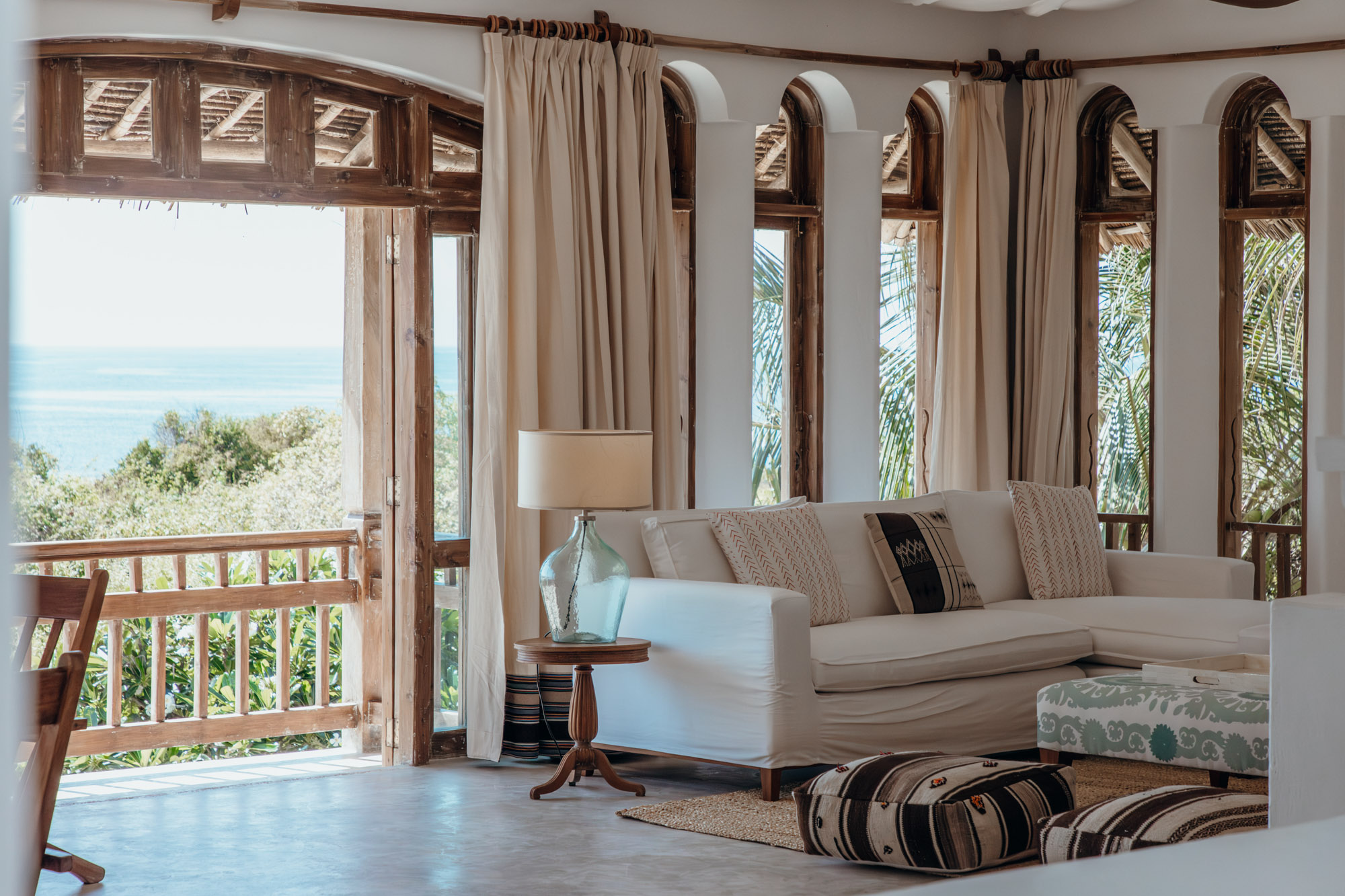 The large terrace and pool area, complemented by shaded baraza seating, create an ideal setting for socialising and enjoying the views. The villa’s magnificent dining area, featuring a grand round table, is perfect for leisurely lunches prepared by the in-house chef. For a change of scenery, guests can enjoy breakfast on the second-floor coral-tiled terrace, complete with a beautifully crafted coconut wood table. Meandering garden paths lead through endemic bushland, offering a peaceful stroll to the cliff’s edge, where a stairway descends to a secluded beach with coral formations and tidal pools for exploration. The roof terrace provides stunning sunset views, perfect for evening sundowners while watching dhows glide across the Mida Channel.