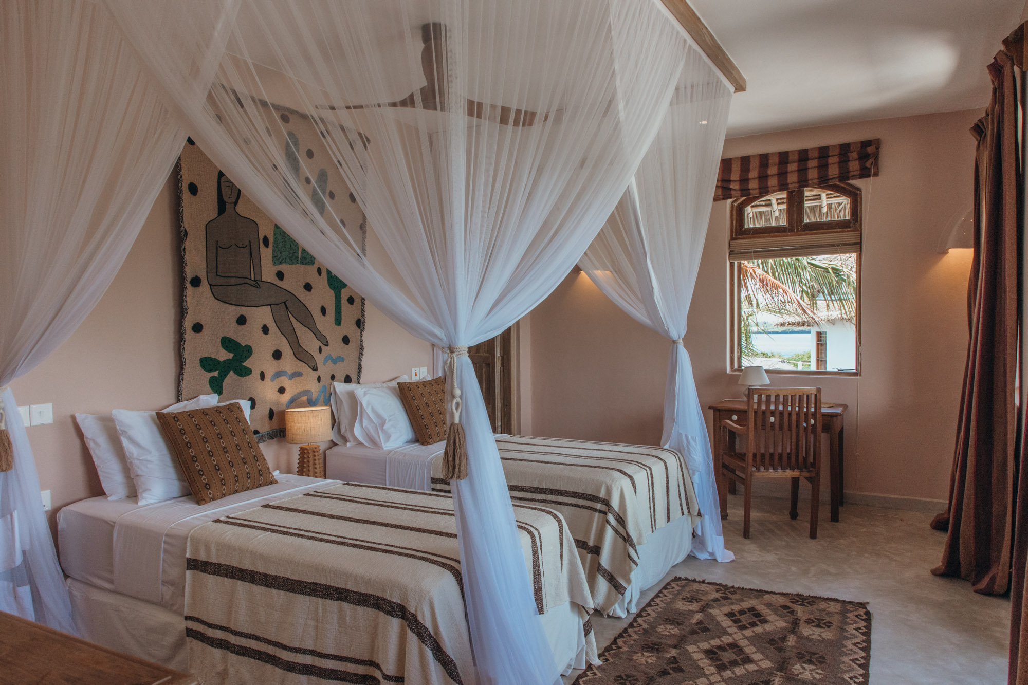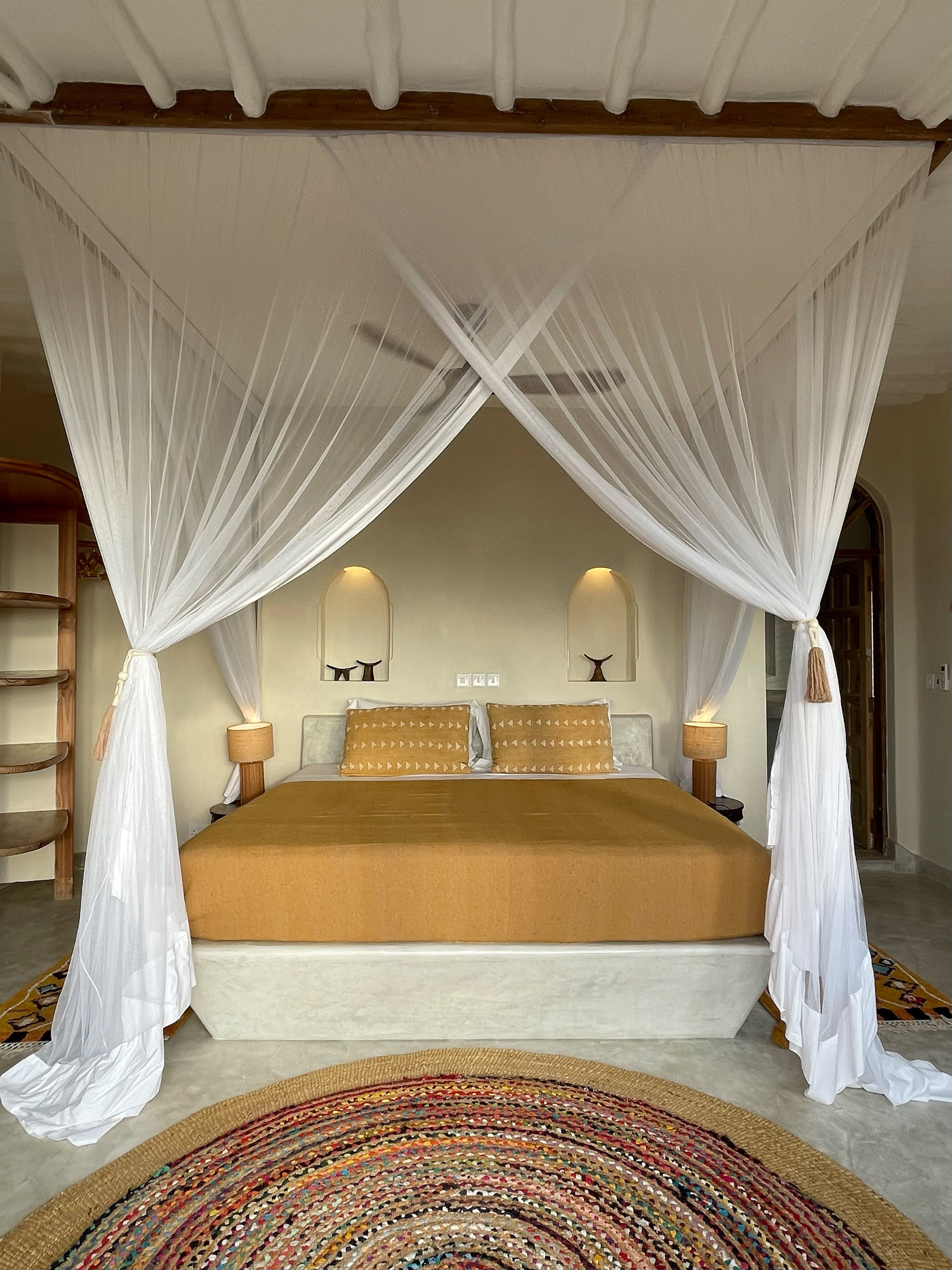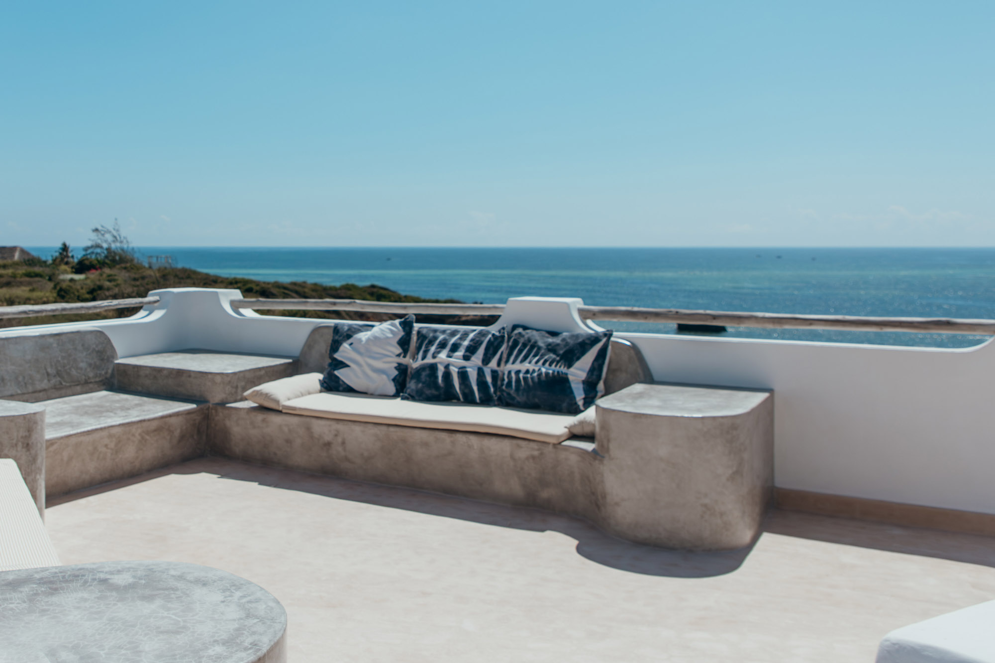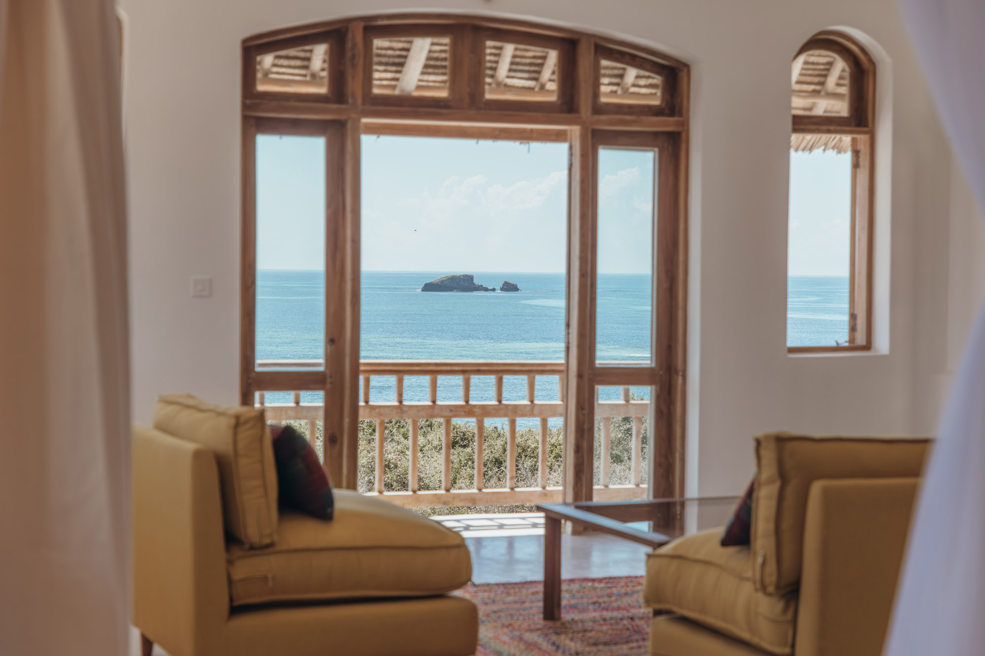The large terrace and pool area, complemented by shaded baraza seating, create an ideal setting for socialising and enjoying the views. The villa’s magnificent dining area, featuring a grand round table, is perfect for leisurely lunches prepared by the in-house chef. For a change of scenery, guests can enjoy breakfast on the second-floor coral-tiled terrace, complete with a beautifully crafted coconut wood table. Meandering garden paths lead through endemic bushland, offering a peaceful stroll to the cliff’s edge, where a stairway descends to a secluded beach with coral formations and tidal pools for exploration. The roof terrace provides stunning sunset views, perfect for evening sundowners while watching dhows glide across the Mida Channel.