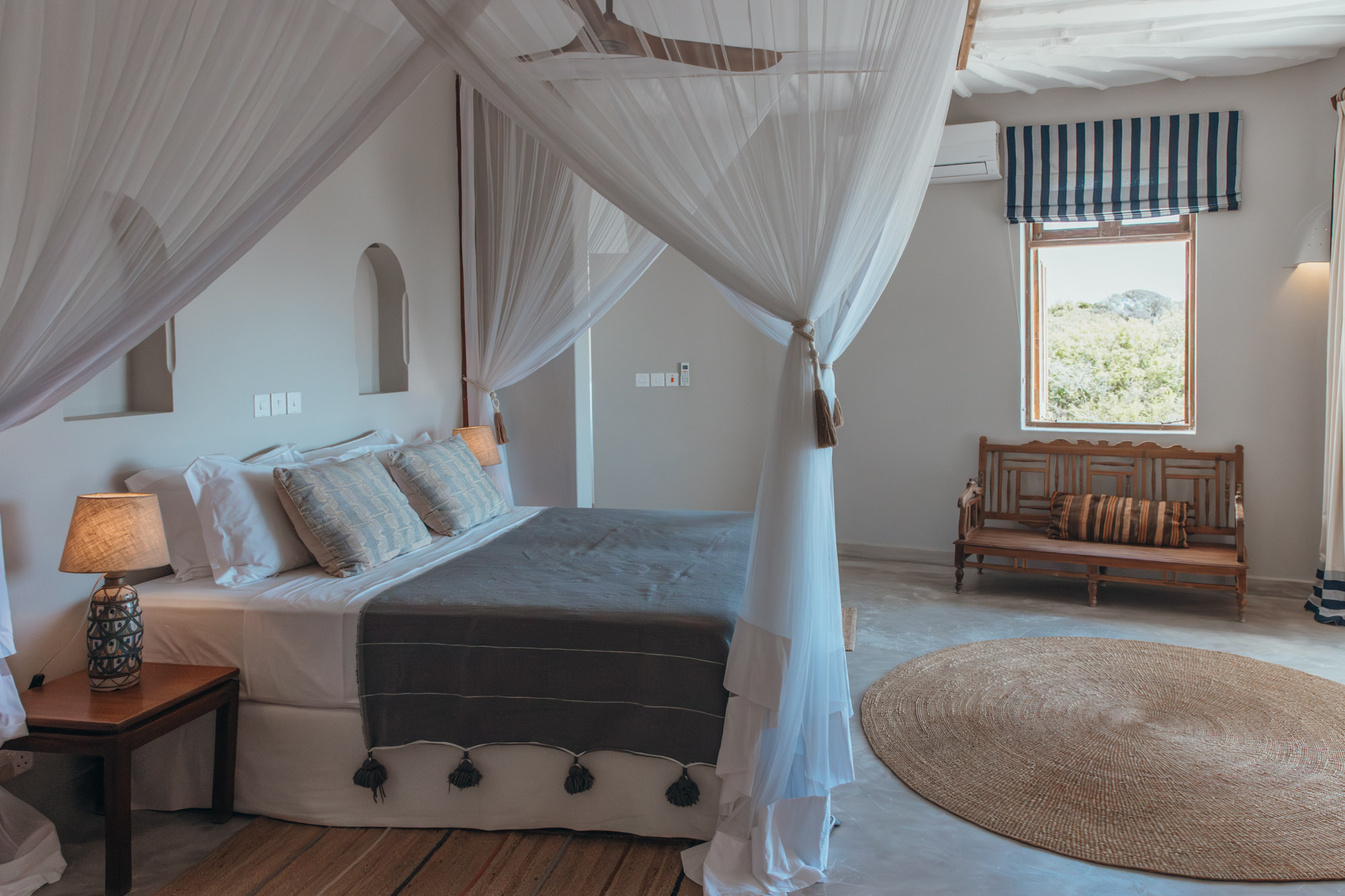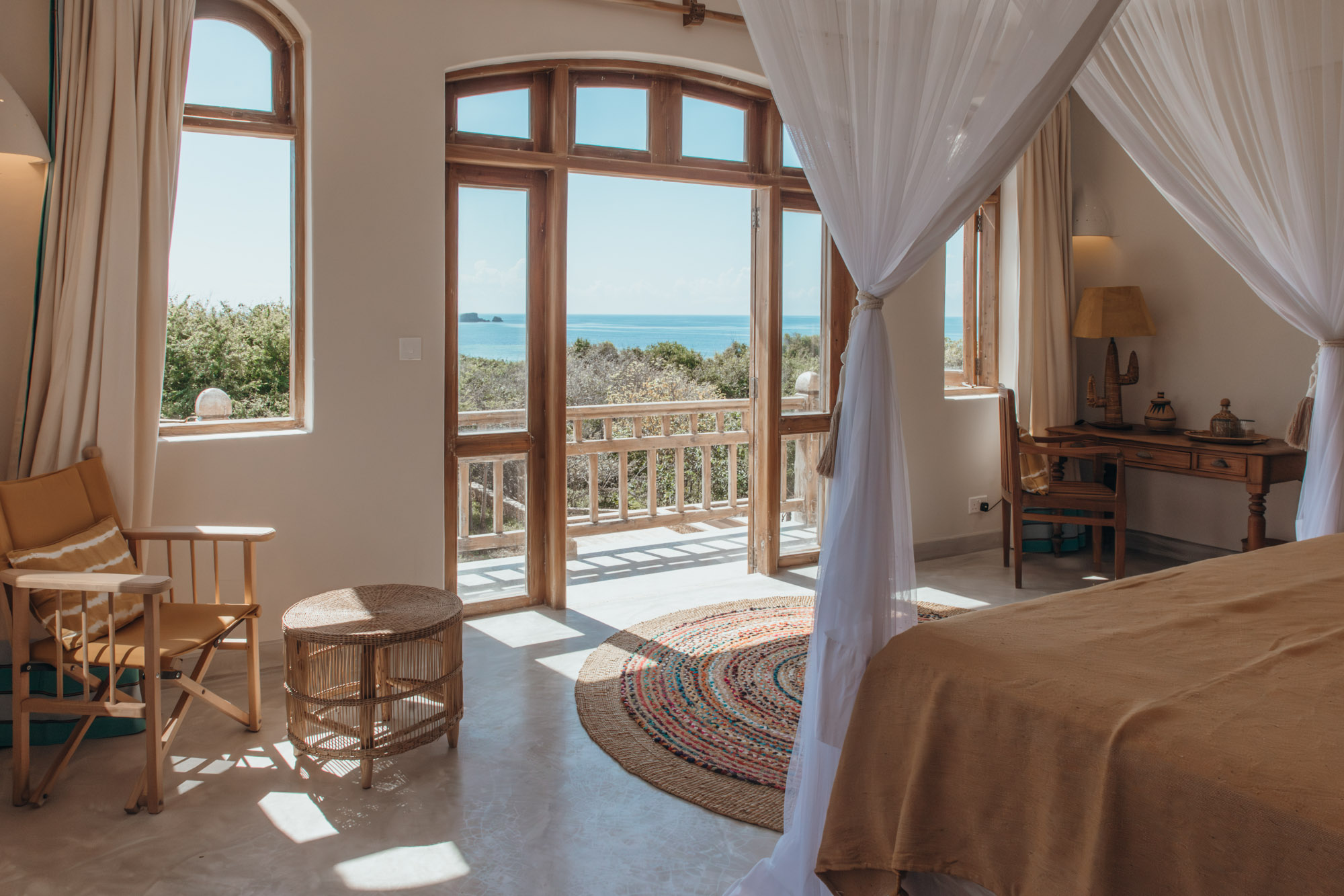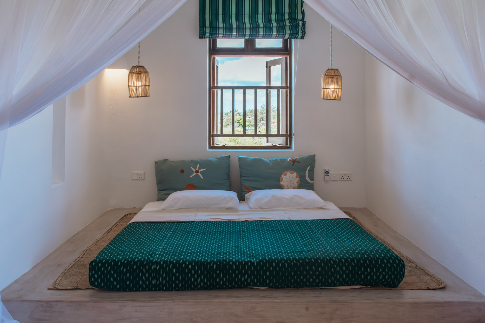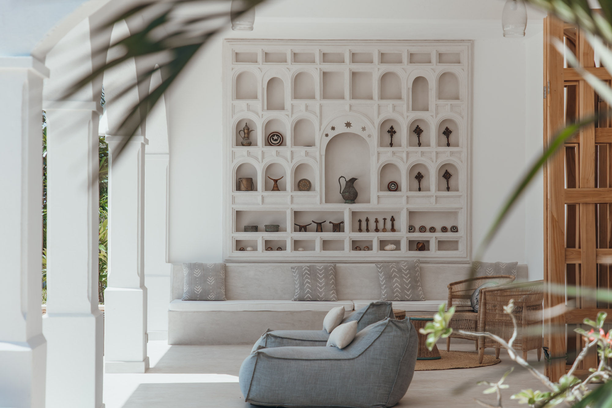 The large terrace and pool area, complemented by shaded baraza seating, create an ideal setting for socialising and enjoying the views. The villa’s magnificent dining area, featuring a grand round table, is perfect for leisurely lunches prepared by the in-house chef. For a change of scenery, guests can enjoy breakfast on the second-floor coral-tiled terrace, complete with a beautifully crafted coconut wood table. Meandering garden paths lead through endemic bushland, offering a peaceful stroll to the cliff’s edge, where a stairway descends to a secluded beach with coral formations and tidal pools for exploration. The roof terrace provides stunning sunset views, perfect for evening sundowners while watching dhows glide across the Mida Channel.