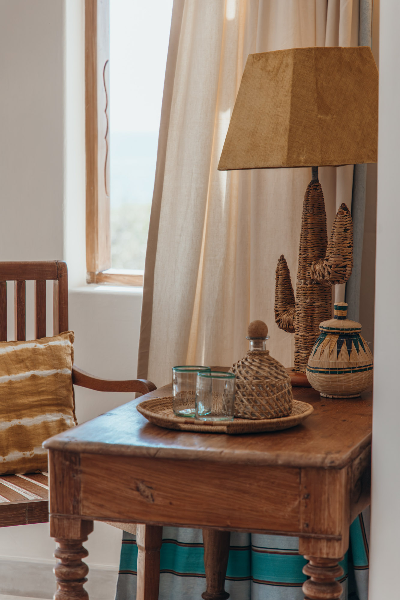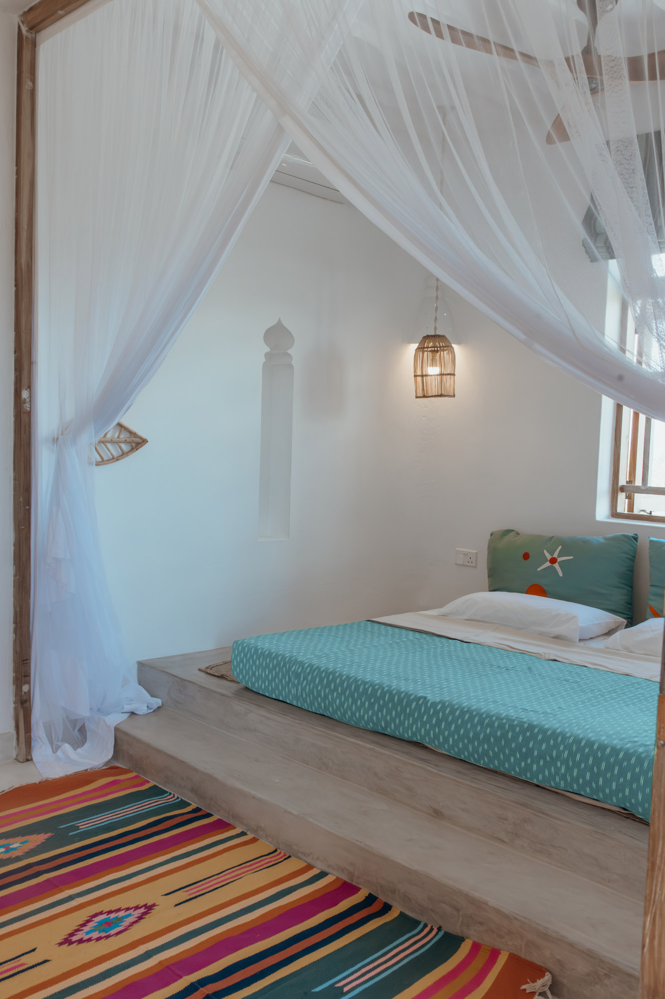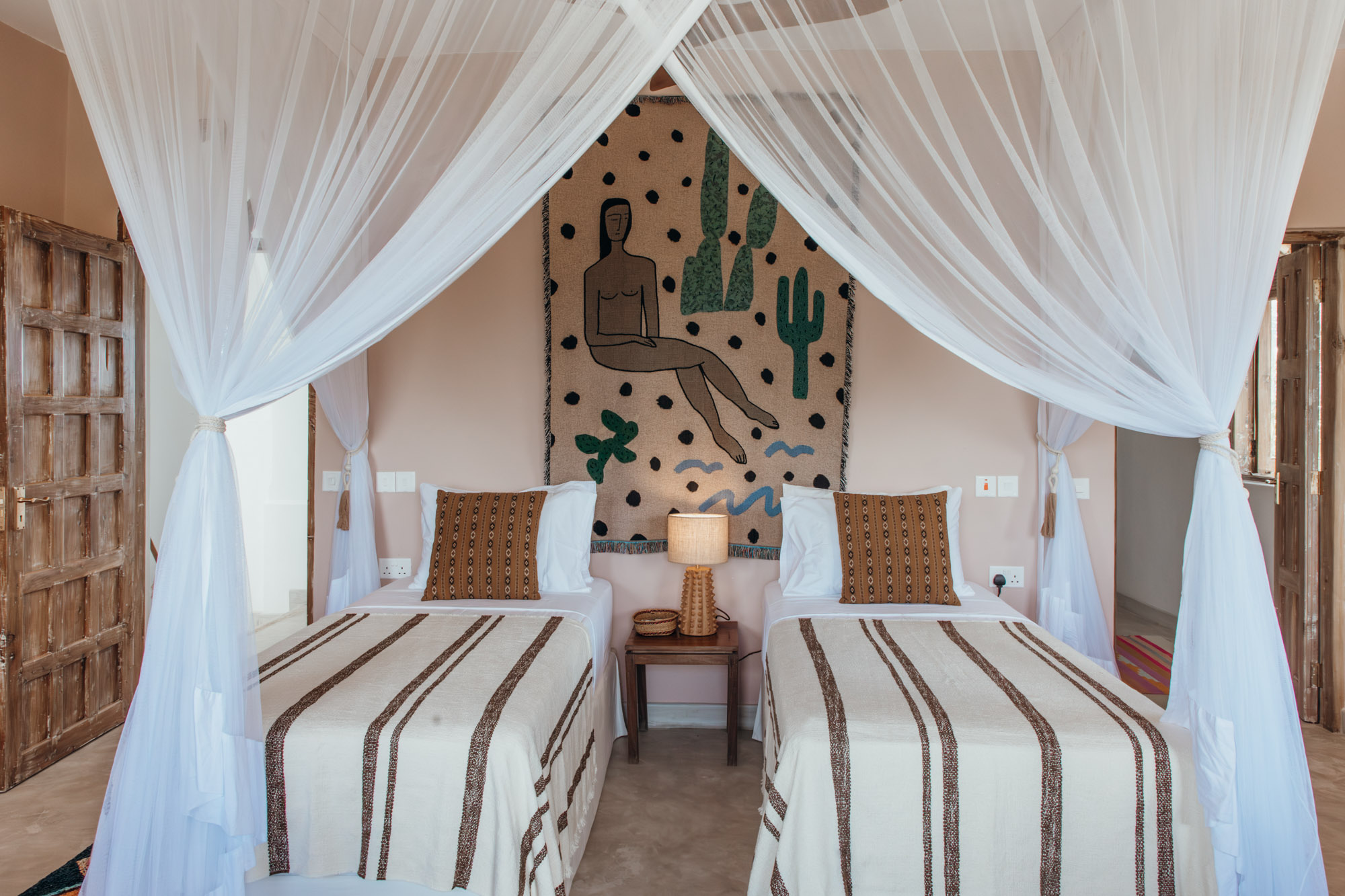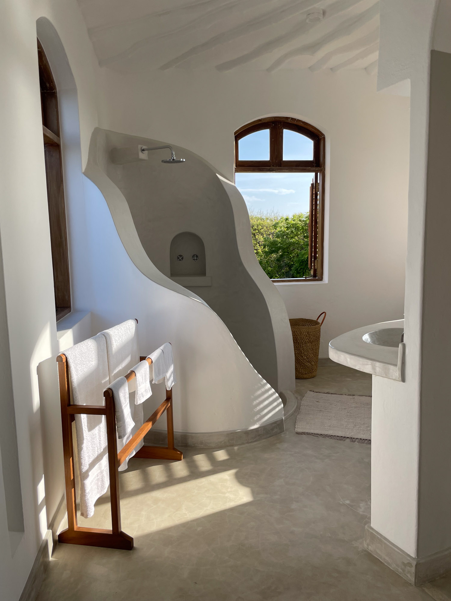 The large terrace and pool area, complemented by shaded baraza seating, create an ideal setting for socialising and enjoying the views. The villa’s magnificent dining area, featuring a grand round table, is perfect for leisurely lunches prepared by the in-house chef. For a change of scenery, guests can enjoy breakfast on the second-floor coral-tiled terrace, complete with a beautifully crafted coconut wood table. Meandering garden paths lead through endemic bushland, offering a peaceful stroll to the cliff’s edge, where a stairway descends to a secluded beach with coral formations and tidal pools for exploration. The roof terrace provides stunning sunset views, perfect for evening sundowners while watching dhows glide across the Mida Channel.