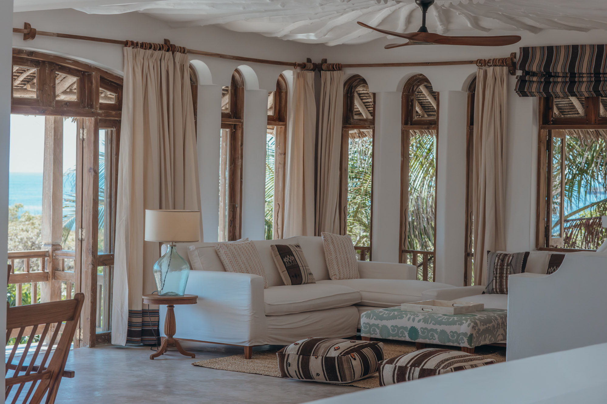 The villa features light, spacious living areas where graceful curves and thoughtful design elements enhance the open, airy feel. The first-floor sitting room offers a peaceful retreat, while the villa benefits from natural cooling through a traditional wind tunnel, ensuring constant airflow. The six bedrooms, each with air conditioning and mosquito nets, provide privacy and comfort. The master suite, located on the second floor, includes an adjoining children’s room, while additional bedrooms on the first and second floors offer stunning views of the sea or the Mida Creek forest.